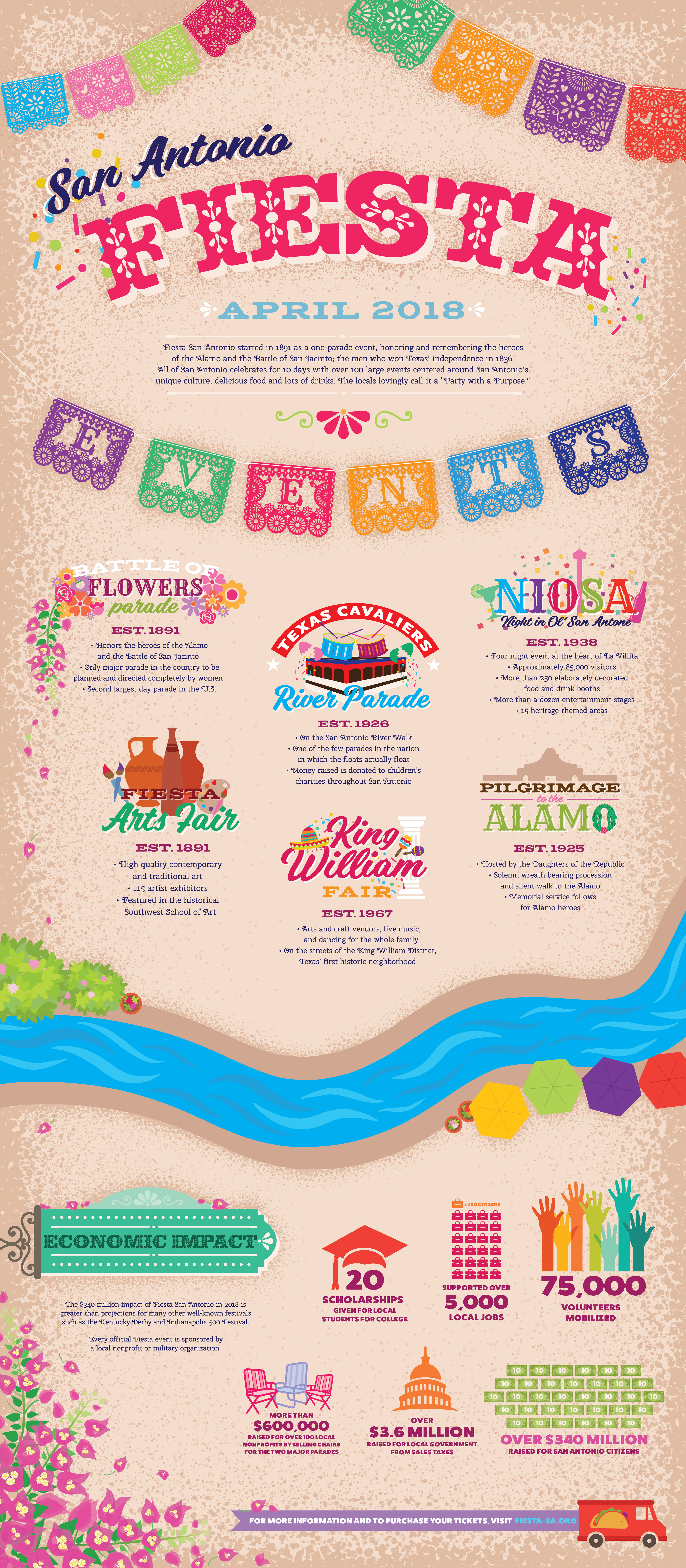 The San Antonio Fiesta is a 10-day annual event in San Antonio, Texas that celebrates the men who won independence for Texas in 1836. This infographic was created to teach non-locals what Fiesta is all about.